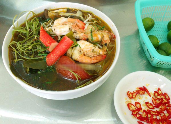 Mấy con tôm đỏ au, những lát cua trắng bóc và thịt bò óng ánh dưới lớp nước dùng hơi ngả màu đỏ cam ấm nồng.