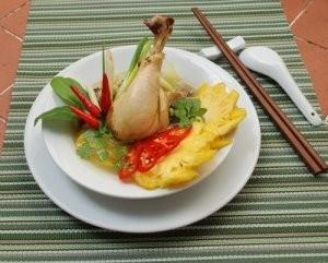 Tỏi gà là phần bắp đùi của gà, phần này thịt chắc và thơm nên khi om với trái thơm món ăn vừa mềm mà không bị nát thịt.