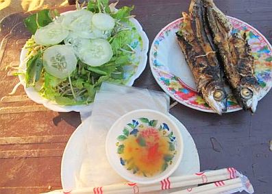Cá chuồn xanh nướng ở ngay bãi biển chỉ