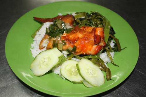 Cơm gà chiên là một món ăn ngon miệng nhưng rất bình dân ở đây. Đĩa cơm với một cánh gà to đùng có giá 20.000 đồng.