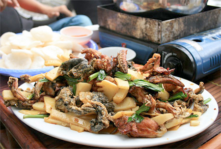 Chỉ mới nhìn những nguyên liệu chủ hàng đem ra đã thấy sự kỳ công của chủ hàng. Những chiếc đùi ếch được tẩm ướp cả tiếng trước khi chiên có màu vàng rượm xếp khéo léo với những miếng măng rừng trên đĩa. Trong lúc ngồi đợi nồi nước lẩu sôi, nhởn nha thưởng thức đùi ếch với măng giòn giòn cay cay cũng thật là thú vị.