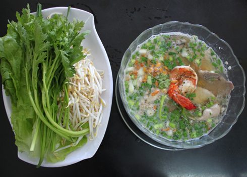 Món ăn đơn giản với ghẹ, chả tôm, tiết lợn, nấm cùng với nước lèo được nấu sánh và rất đậm đà. Điểm thu hút khách là những con ghẹ còn sống được chủ quán chế biến ngay trước mặt thực khách. Gia vị ăn kèm không thể thiếu món muối tiêu chanh. Cắn miếng càng ghẹ, chấm ít muối tiêu chanh để cảm nhận được thịt ghẹ vừa ngọt vừa thơm trong miệng.